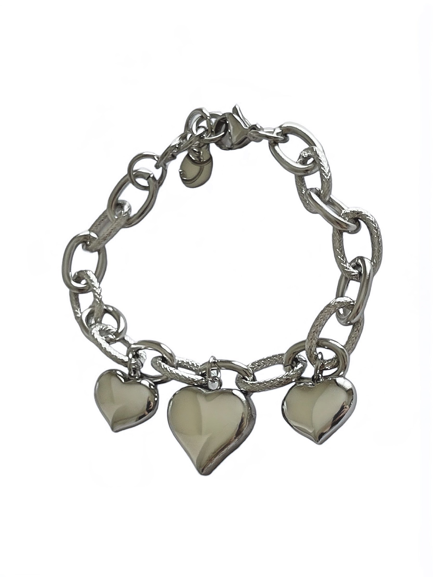 La struttura di questo bracciale è composta da una robusta catena in acciaio inossidabile, che conferisce un tocco di raffinatezza e durabilità nel tempo. Al centro del design, sono presenti tre pendenti a cuore, anch'essi realizzati in acciaio inossidabile. Questo bracciale è perfetto per chi ama i simboli d'amore e desidera un accessorio versatile, adatto sia a look casual che formali.