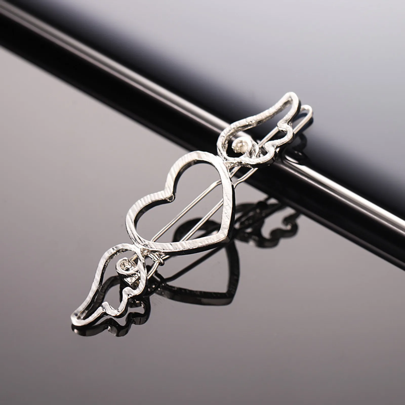 Fermaglio per capelli a forma di cuore con ali, chiusura a scatto.