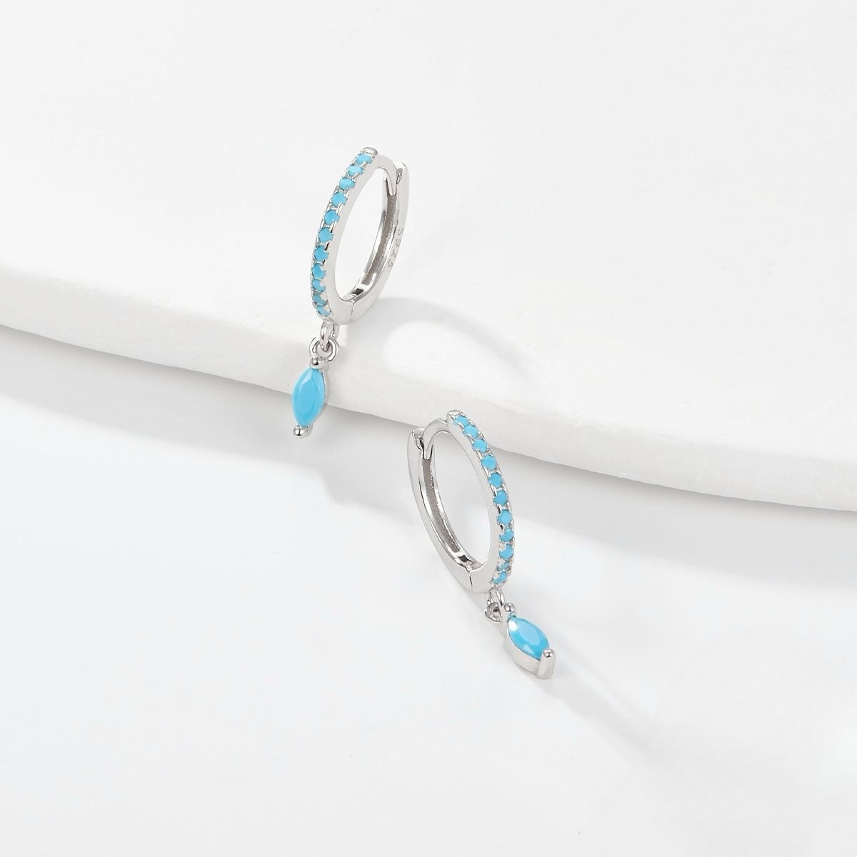 Questi orecchini a cerchio presentano un pendente a forma di goccia di colore turchese. Il pavé sul cerchio è ornato da zirconi, anch’essi di colore turchese. Perfetti da abbinare con l’anello coordinato.